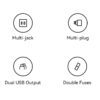 - Multi Jack, Multi-Plug, Dual USB Output, Double Fuses